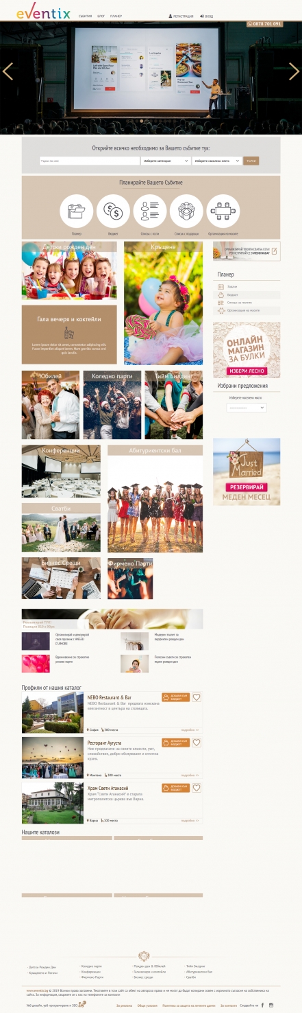 Уеб дизайн на интернет сайт за организиране на събития. Този интернет проект, подобно на WeddingDay.Bg, включва в себе си каталози и фирмени профили, инструмент за планиране и бюджетиране на събития.